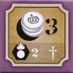 投資タイルのひとつ。上段(メジャーアクション)にあるのは「経済」の投資を表し(お金のシンボル)ポイントは3です。下段(マイナーアクション)は「軍事」のシンボル(当時の手榴弾だそうです)でポイント2。またその右側にある十字マークは手札のイベントカードからイベントを発生させることができることを表しています。