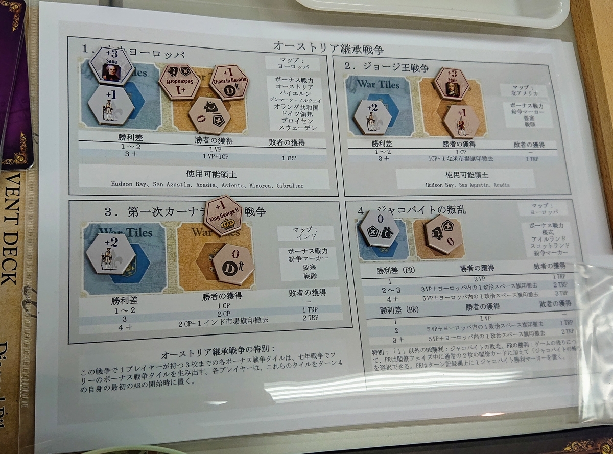 オーストリア継承戦争の解決に用いられるシート(ゲームオリジナルはもちろん英文だが、写真は有志が公開している和訳版)。4つの戦域が含まれ、戦域毎に戦力を比較して勝敗が決せられる。