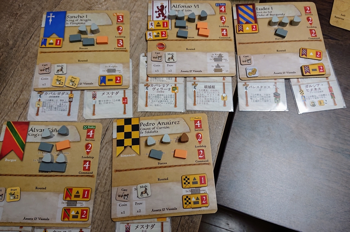 家臣カードの上には、部隊を表す木駒以外に、荷馬車やロバのマーカー、さらに現在保有している資源を表すマーカーが載せられている。