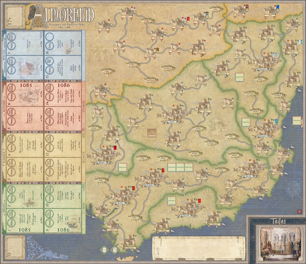 何度読んでもなかなか覚えられない本作のタイトルはムラービト朝の英語読み(英語では、アルモラヴィッド朝と呼称する)らしい。ムラービト朝は、11世紀から12世紀の100年ほどモロッコを中心とする北アフリカから本ゲームが扱うイベリア半島の南半分について勢力を誇った。その名称であれば、世界史の歴史地図帳で見たような覚えがある・・・ような気がする。