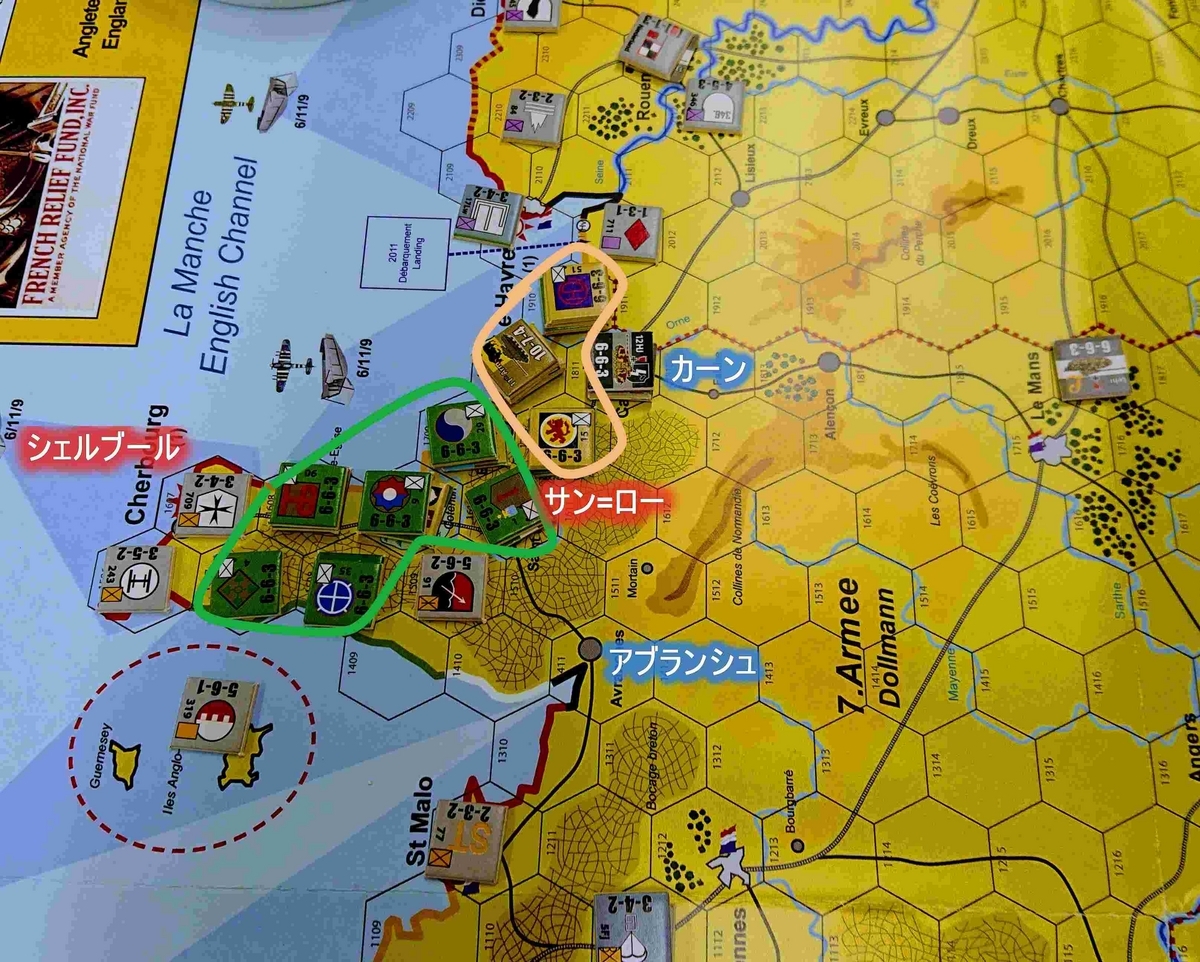 ドイツ軍による戦線の引き直しにより連合軍は少し前進しましたが、高地沿いに引かれたドイツ軍の防衛線で止まります。シェルブールへの攻撃は、1ユニットを除去したものの、陥落は次ターンにずれ込んだようです。